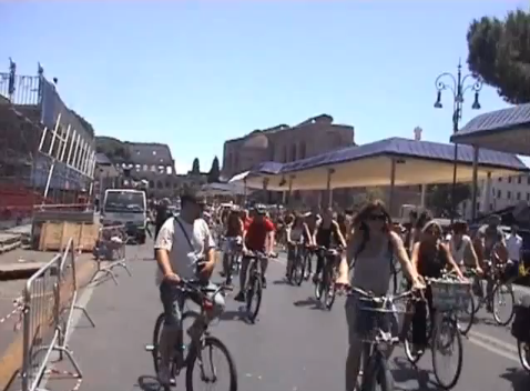 The great thing about Critical Mass is the experience of riding around Rome without a. breathing fumes, b. being deafened by engine noise and c. risking being hit by motor vehicles. Occasionally I’ve had this same experience when streets have been closed to traffic for special events or emergencies, but until Rome wakes up to the fact that car-free streets are better for everyone the only chance to briefly experience this bliss once a month or so is through militant biking. If that means ticking off a few drivers, so be it.