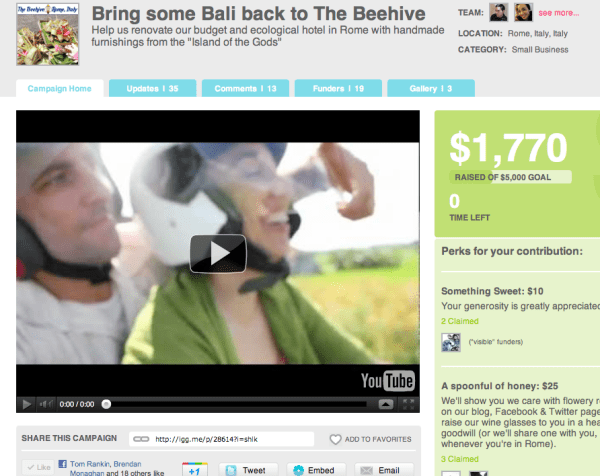 When I first found out about crowdfunding I thought it was very cool and wanted to do it even though I didn’t have a project to fund. I just loved the idea. At some point we had to decide whether to get rid of the things we’ve acquired here (some furniture we bought for the house we live in, books, etc) or if we had enough to justify a shipping container, at which point we’d then have enough space already paid for to justify bringing things back. We new we’d need help and that if we didn’t raise some money that we’d pay for our things to ship back in a mostly-empty container, which is hugely wasteful. Banks aren’t particularly generous with me, nor are they easy to work with or speedy, so that was never considered. Initially, we feared that this would be seen as us basically asking for money, but really I think we’re offering enough rewards that are valuable on different levels that what we’re doing is seeking a fair exchange. We’re trying to raise some money, just like you’d do at a garage sale. Maybe the exact price asked isn’t completely comparable, but we’re also offering an opportunity for people who have enjoyed staying with us, or might someday stay with us, to be a part of our growth and their own comfort. We want people to feel as though their contributions were valuable despite what they got in return.My parents owned a small grocery store that had been in my family for a few generations. In the 80′s I remember it was really fashionable to shop at big, mega stores (which if you compare them to today’s megastores are pretty small). My parents sold the business as they couldn’t compete. Now, in 2011, with main street dead, people realize that they liked buying things from the guy who knew their name. Part of the appeal of Italy is that main street never died there for a series of cultural and architectural reasons. So I see the world – and I mean the modern, Anglo world – as having a huge appetite for things that are bought from a real family business – something that many American kids under 20 years old have never really experienced. Now, when you pay for something at a big, impersonal store, you get the thing you paid for – and most times because of volume, you get it for less than what you’d pay at the family run business. But when you know that family, and you know your money is helping them pay for their kids’ education, or that the money is then going into the other family’s pocket who owns the bakery, you start to feel a benefit that is impossible to quantify and monetize from being part of an economy that grows more than just pieces of green paper. For me, crowdfunding and the kind of web commerce 2.0 you mention allows us to be global but always buy local and see the impact of where our money is going.What strategies do you have for telling the story of Bali in the Beehive in Rome that will distinguish your project from the simple purchase of cheap foreign furniture?