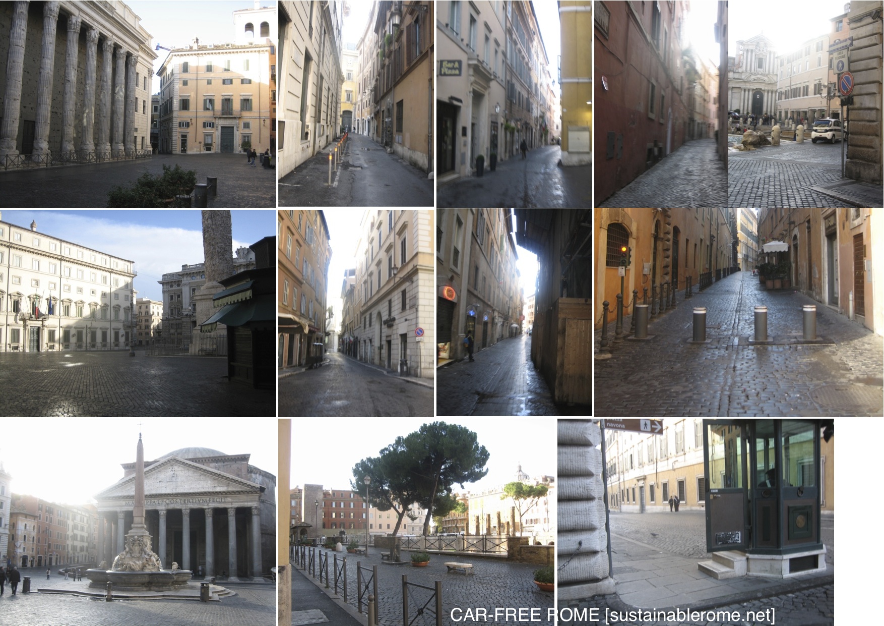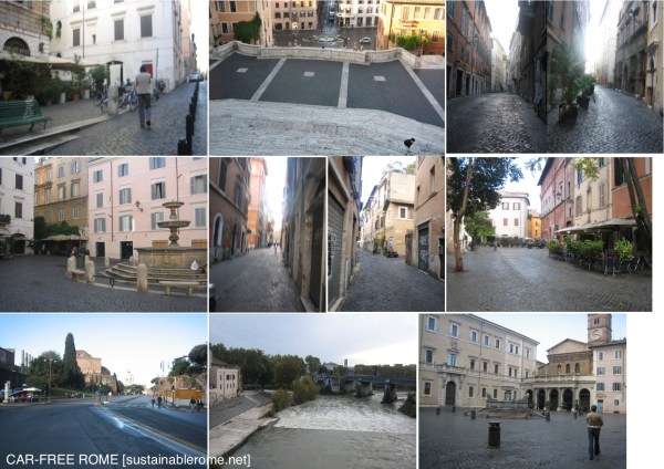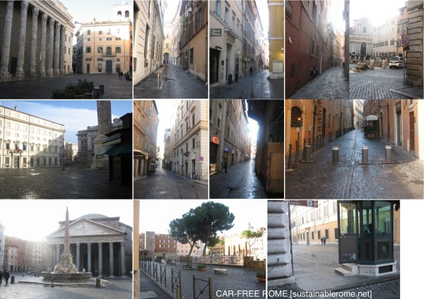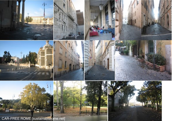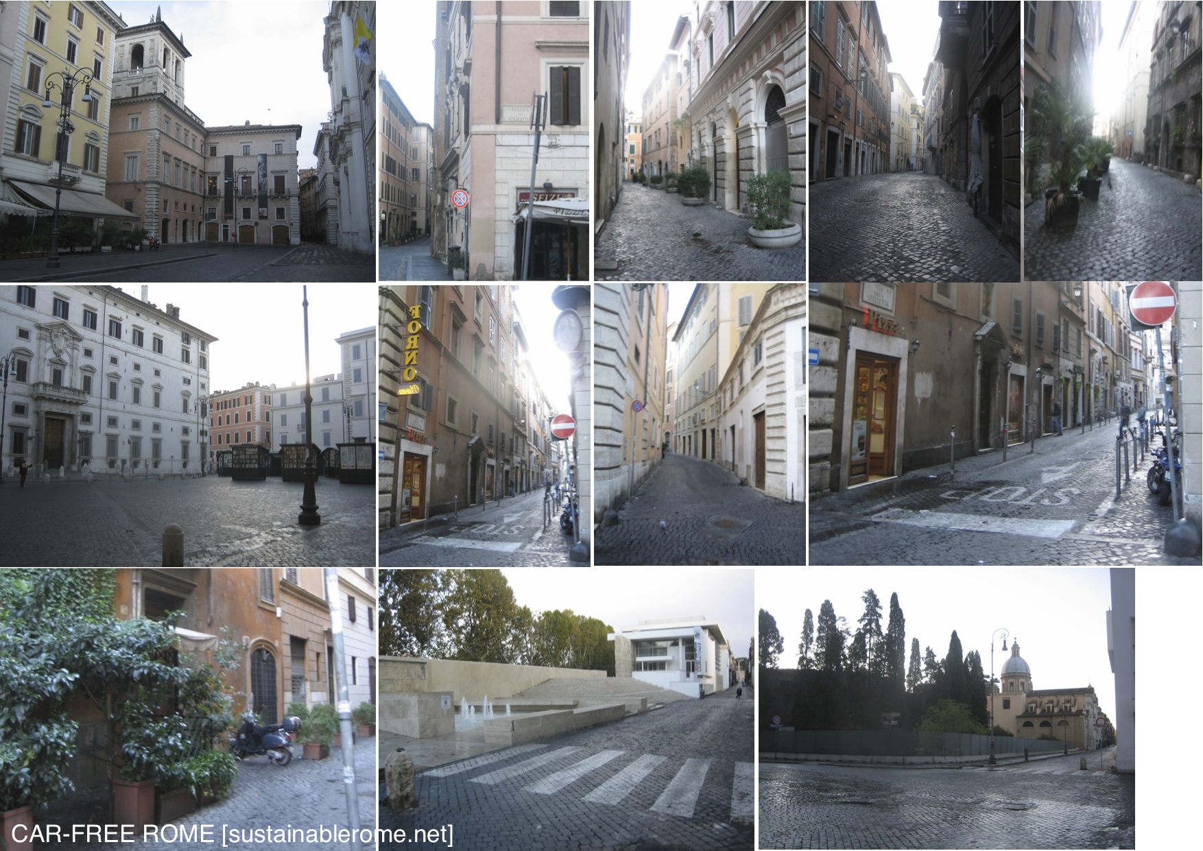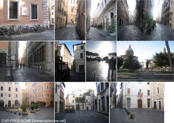 So today I went out with a goal in mind, to see past the problems to the city which persists despite them.  Without really planning it, this turned into a project to photograph the city without cars. This is the opposite of what I often do, photographing the illegal presence of cars in pedestrian space to report or denounce; it turned out to be a bit more difficult.  But on a Sunday morning, with shops and city offices closed, many streets and squares were pleasantly car-free.  I’ve often used stills from neo-realist films in talks to show a Rome which functioned with little automotive traffic, bustling with trams, buses, bikers and pedestrians. And I’ve pointed out how certain “emergencies” such as political demonstrations or last month’s torrential rains create defacto car-free zones. But today I looked at the everyday city for glimpses of the promise of car-free urban space.