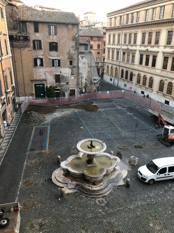 Since November I have watched work proceed slowly on Piazza Cinque Scole where I teach. Bids had gone out for the repaving of the square. Repaving, not the design of urban space, to the improvement of pedestrian experience, not the construction of structured, underground parking, but simply repaving the square. Cobblestones were removed and are now being repositioned. It is wonderful to watch the skilled workers doing the job that has been done for centuries. But there is one major difference; rather than laying them in a bed of sand with permeable space between the stones, the joints are being sealed with asphalt. And this isn’t a mistake on the part of the building crew: it was actually requested in the brief. Thus a principal benefit of this traditional paving, that it allows rain water to be absorbed rather than rushing to the storm sewers, has been discarded. Eventually when they complete the work the fencing will come down, cars and trucks and scooters will move back into the piazza with all their weight defeating these months of work and thousands of euros of investment.
