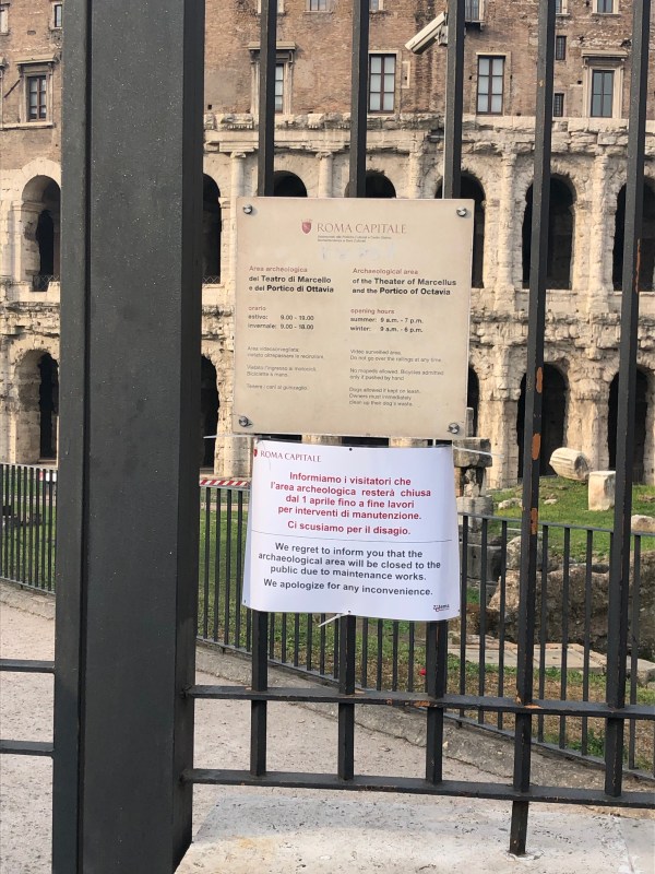 I’d like to be able to remind him how great it is to walk from the Campidoglio to the Tiber Island, to experience so much of Rome’s ancient history in such a short space. But it has become so dangerous to cross the street below the Campidoglio that the pedestrian crossing that the previous administration erased is once again half-visible, people tentatively step out but jump back in the face of speeding traffic. And if they do make it across they are faced with disappointment at the gates to the archaeological passage from the Theatre of Marcellus to Portico d’Ottavia, closed indefinitely.
