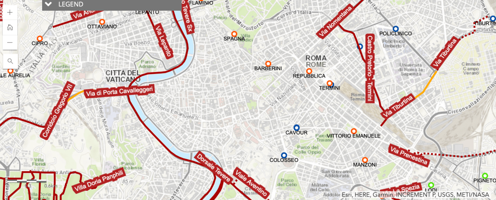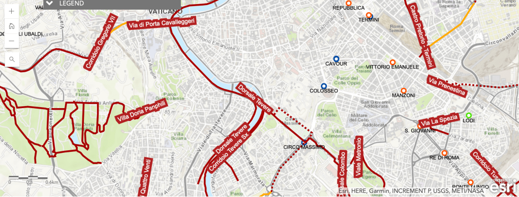 Parks seem to be webs of bike paths that go nowhere (yet we know these are simply places for recreation). If we use this criteria — equating pedestrian paths as bike paths — then we should label much of the historic center with red. Then there are paths like Via Portuense or Viale Quattro Venti which end suddenly, disconnected from any network. Why isn’t Via del Corso shown as a bike path, considering it is closed to traffic between Largo Chigi and Piazza del Popolo? Or Via Coronari? Or Via Capellari? Is it perhaps because even the pedestrian streets are, defacto, filled with cars?