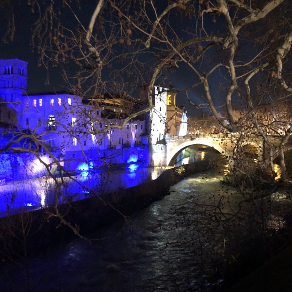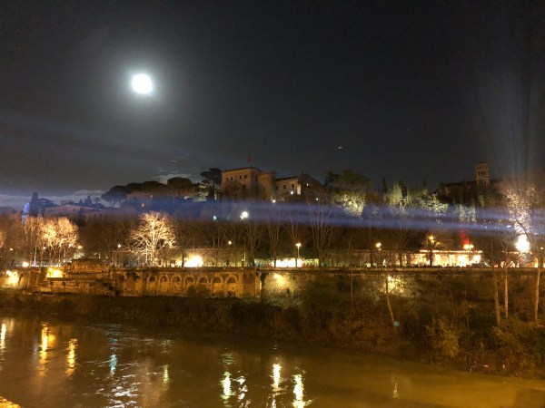 Ponte Sublicio. Spotlights strike laser lines upstream through the misty winter sky, playing off the full moon and Tiber reflections. The Lungotevere is car-free from Piazza dell’Emporio all the way to Via Arenula–really car free, not limited traffic with the occasional police car or politico careening through. Bands playing here and there, with small groups of spectators. Walking along the riverside, music wafts toward me, lights illuminate spectacular vistas, but it doesn’t feel like a disco and it doesn’t distract from the spirit of place.