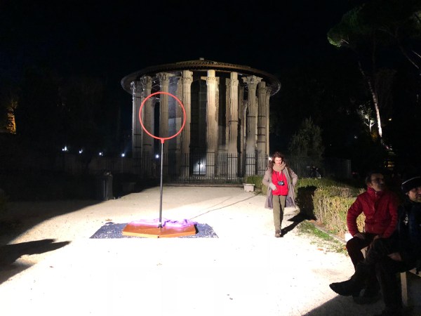 Suspended above the piazza was “Day Hole” a video installation with a disk of daylight sky, playing nicely off the same-sized moon. The taranta pizzicata band Canzoniere Grecanico Salentino rocked, while nearby Opera Camion waxed lyric. Finally, returning to the Tiber, projections onto the Tiber Island, along with devastatingly beautiful illumination of Ponte Sisto, convinced me that this event is the best thing to come to Rome since Triumphs and Laments.