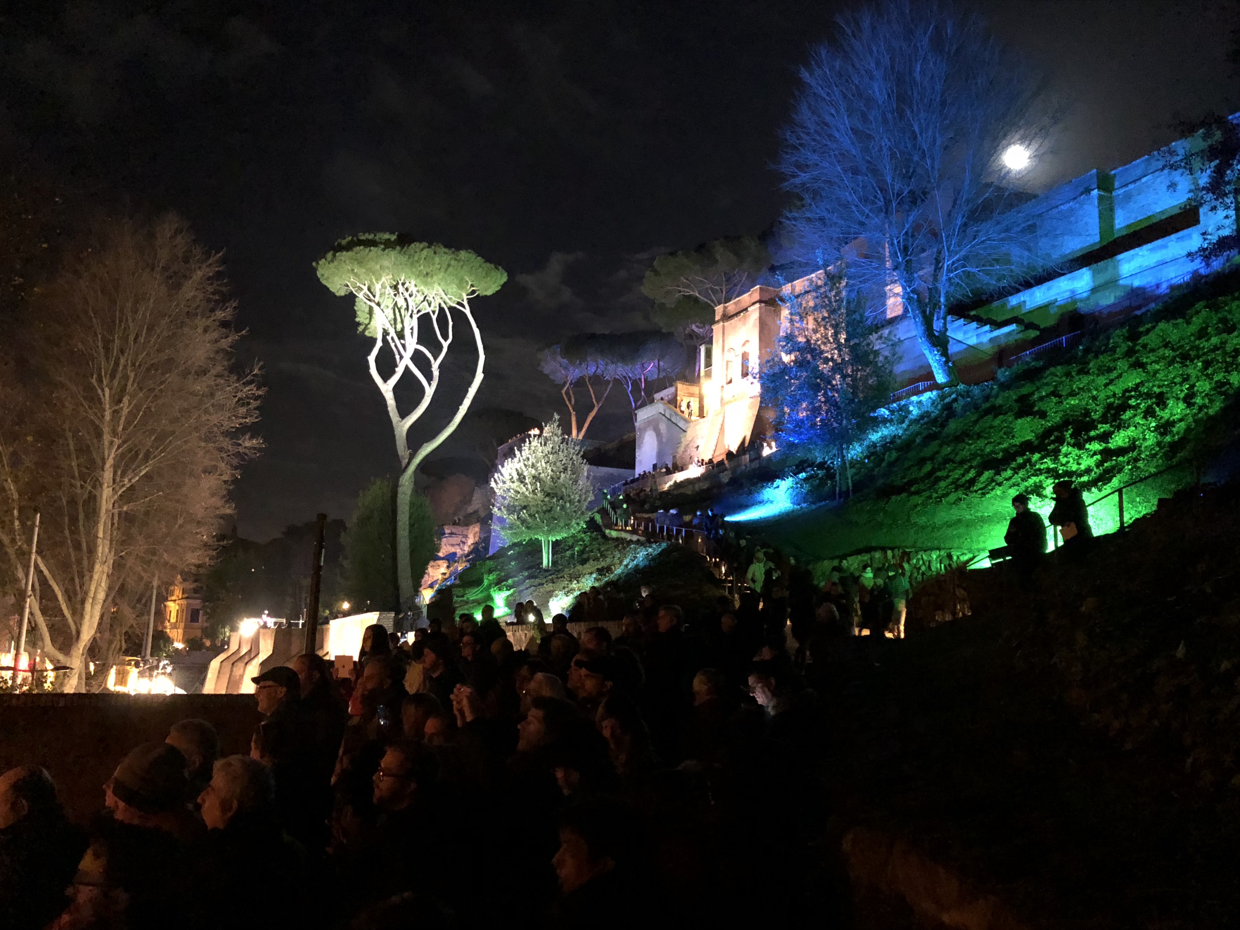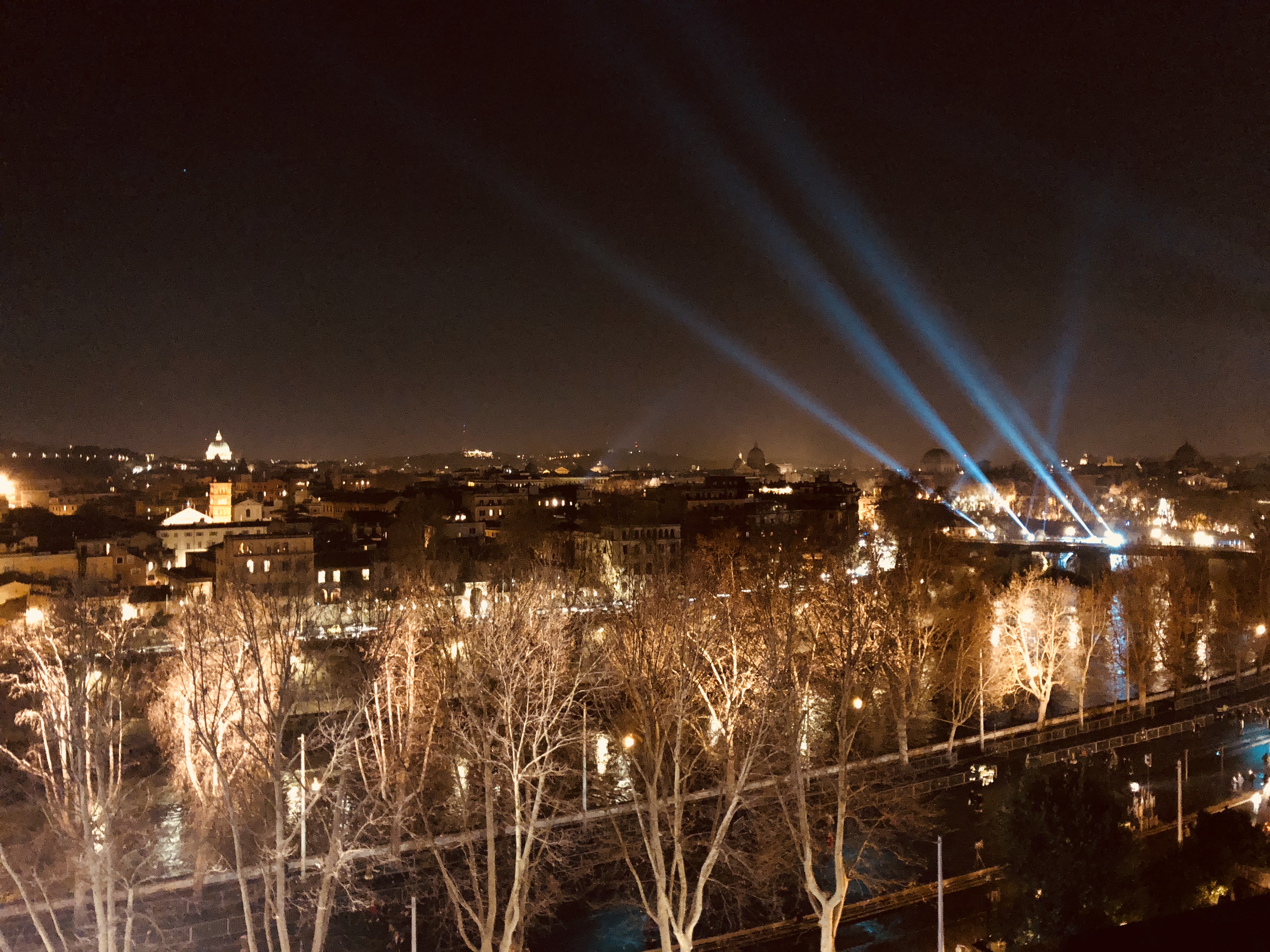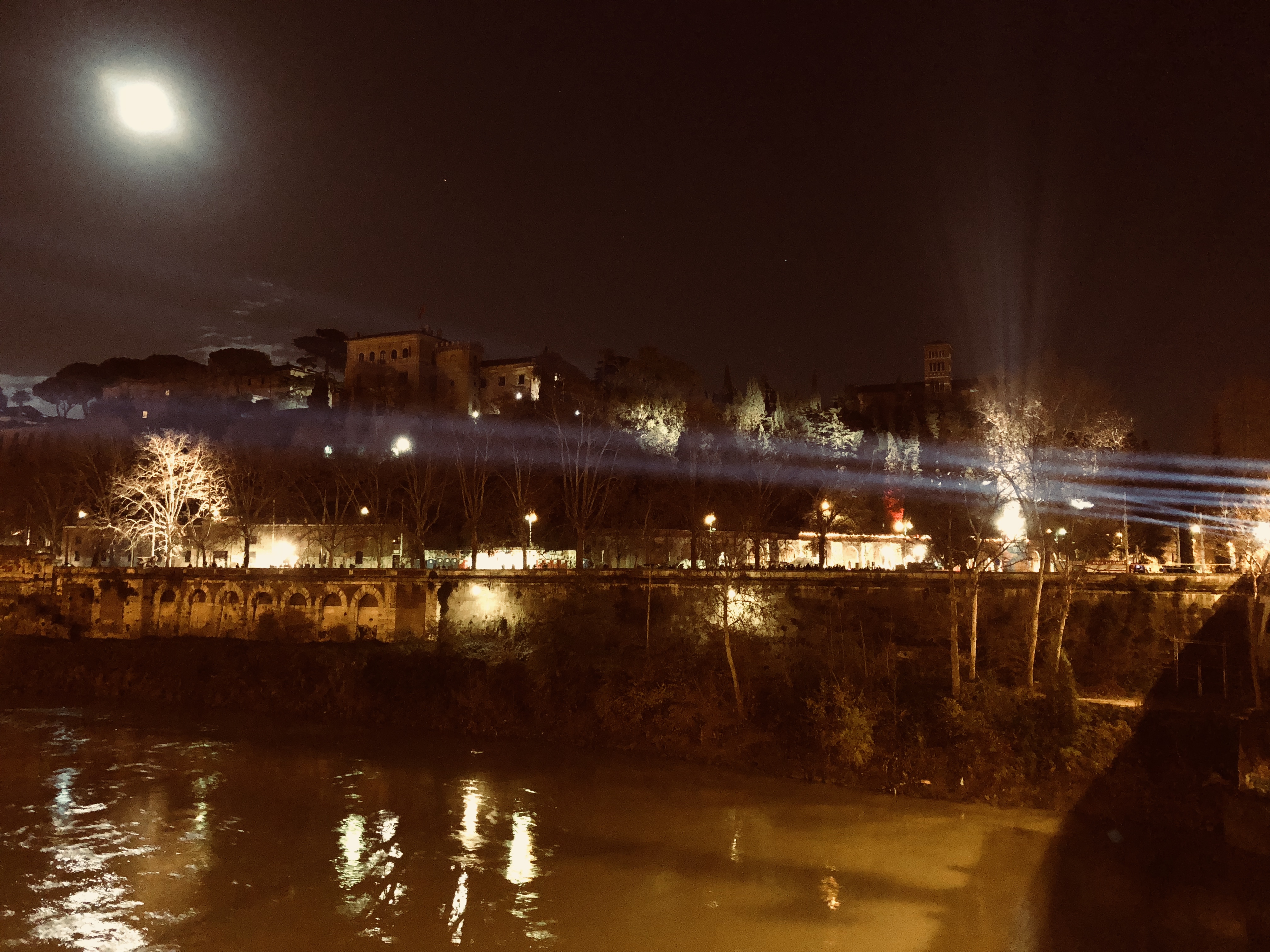 Ponte Sublicio. Spotlights strike laser lines upstream through the misty winter sky, playing off the full moon and Tiber reflections. The Lungotevere is car-free from Piazza dell’Emporio all the way to Via Arenula–really car free, not limited traffic with the occasional police car or politico careening through. Bands playing here and there, with small groups of spectators. Walking along the riverside, music wafts toward me, lights illuminate spectacular vistas, but it doesn’t feel like a disco and it doesn’t distract from the spirit of place.
